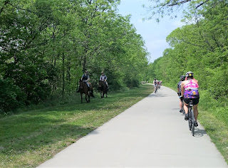 The ride is noted as 48 miles long and is a 'there and back' ride. I wanted to ride over 50 miles so between the ride from the parking lot to the check-in spot and going a little farther at the bridge, we got 51 miles! Woo hoo! We would have ridden to the next small town but the weather was a concern...as it was we only had to ride 1 1/2 miles in pouring rain on our way back.